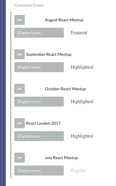 Each item contains link to the event document (also created on Prismic), and Display Level option. Display Level can be set to Featured, Highlighted or Regular.